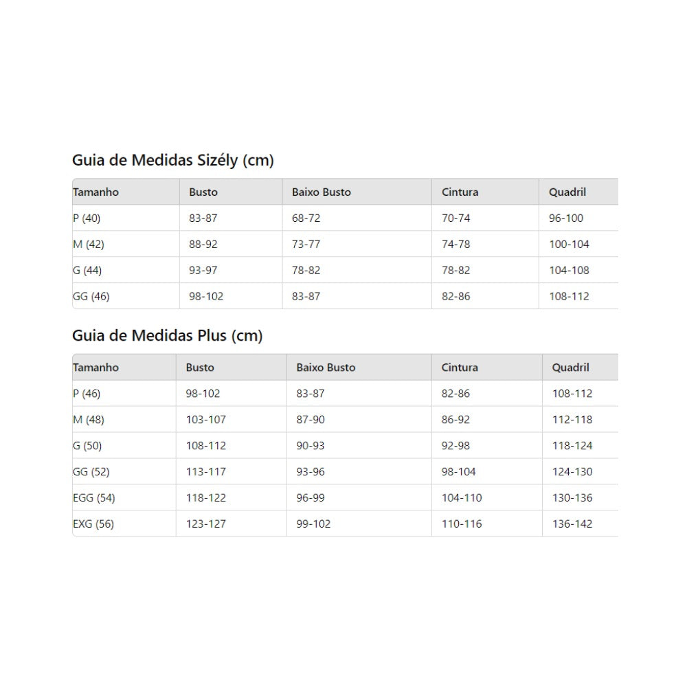Tamanhos: P ao EXG plus size.