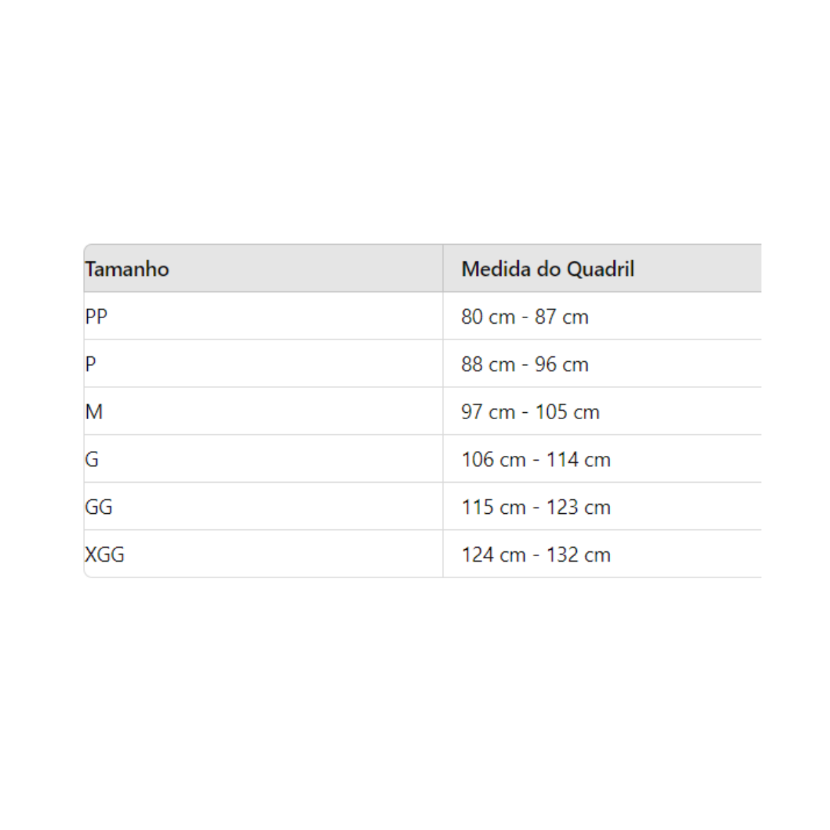 PP: 80cm - 87cm P: 88cm - 96cm M: 97cm - 105cm G: 106cm - 114cm GG: 115cm - 123cm XGG: 124cm - 132cm