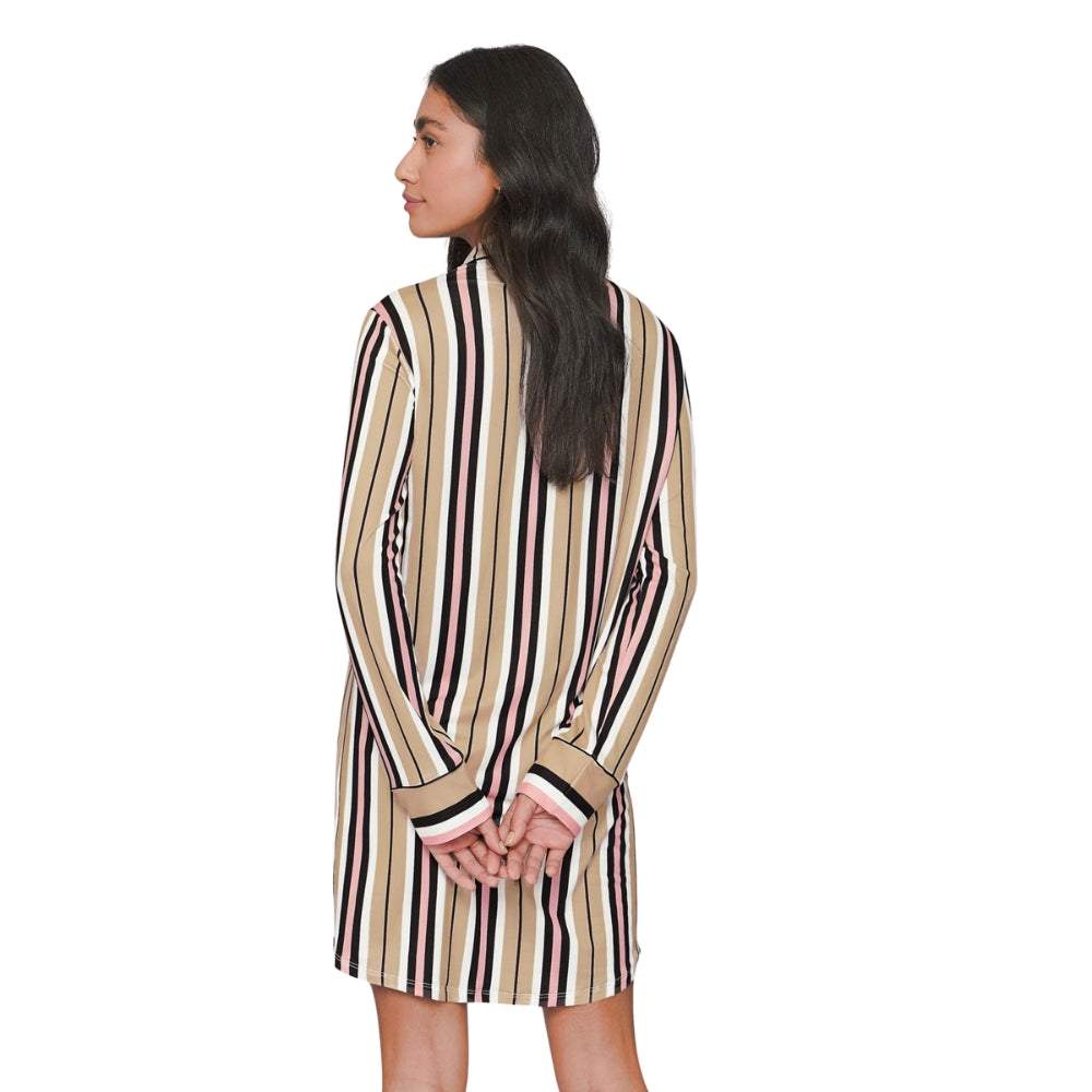 Chemise estampada, fabricado em sublime touch, malha com toque pele de pêssego. Possui abertura frontal com botões personalizados e punhos e bolso com arte localizada. A estampa de listras é um clássico e aqui aparece reinventada em tons femininos.