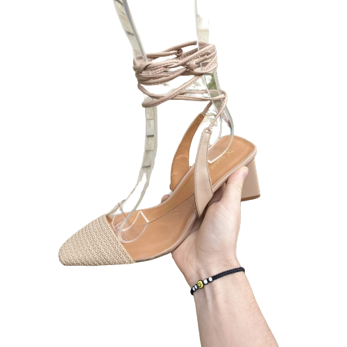 Design Luxuoso e Único: Esta sandália apresenta um design verdadeiramente único e luxuoso. As tiras trançadas combinadas com detalhes em vinil criam um visual sofisticado e atraente. A cor nude confere um toque clássico e elegante.