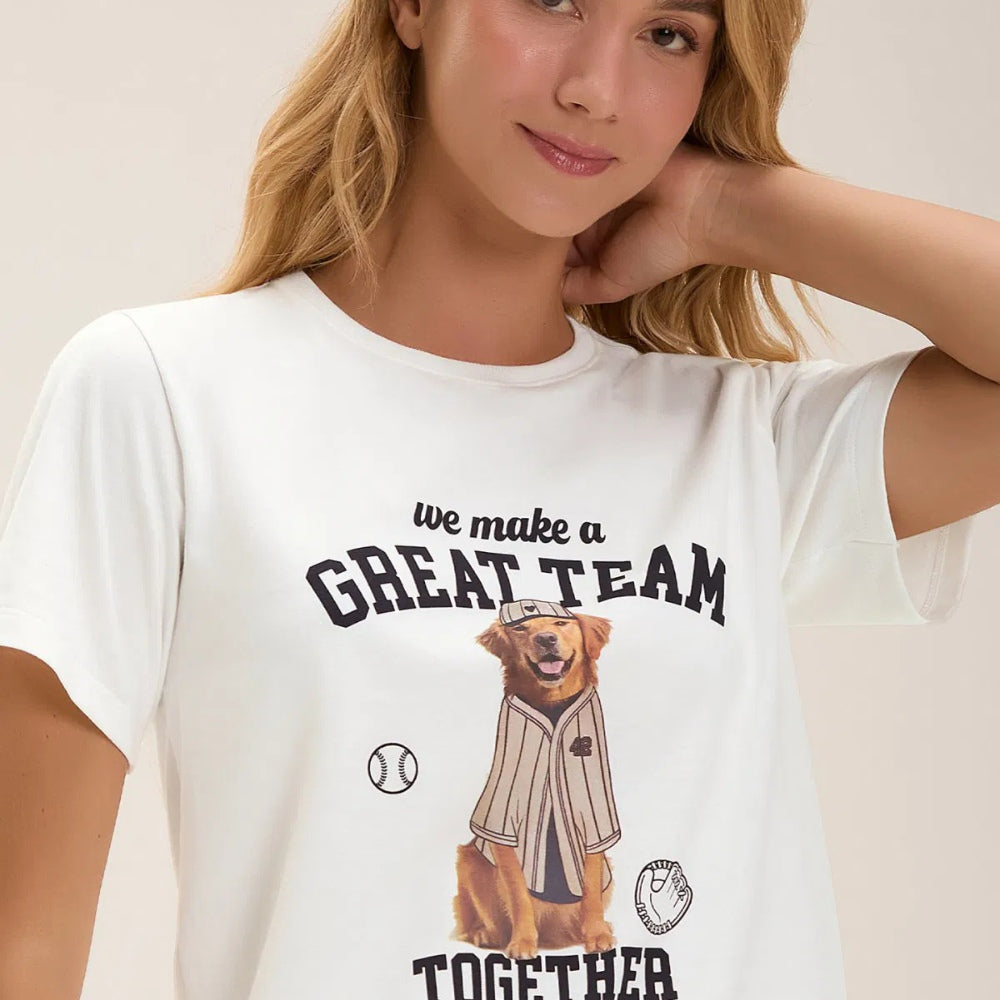 Pijama manga curta com shorts em malha comfort, perfeito para noites descontraídas com um toque divertido. A blusa tem fundo off white e estampa localizada no centro do peito de um simpático golden retriever vestido com uniforme de beisebol, acompanhada da frase “We make a great team together” — traduzida como "Nós formamos um ótimo time juntos". Já o shorts traz fundo azul marinho com estampa rotativa de listras off white, cós com elástico confortável e detalhe de falso amarrador em cadarço de algodão azul marinho, garantindo charme e praticidade.