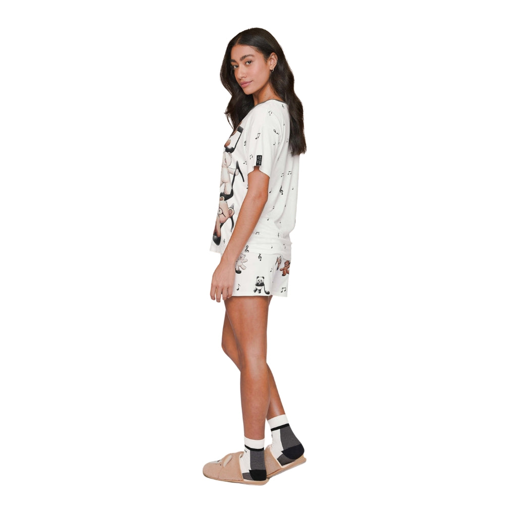 Pijama curto confeccionado em malha sublime touch, com toque macio e aconchegante, semelhante à pele de pêssego. A blusa de manga curta possui gola em ribana mescla contrastante, trazendo um toque de modernidade à peça. O shorts, de modelagem solta, conta com elástico na cintura, proporcionando ajuste seguro e confortável.