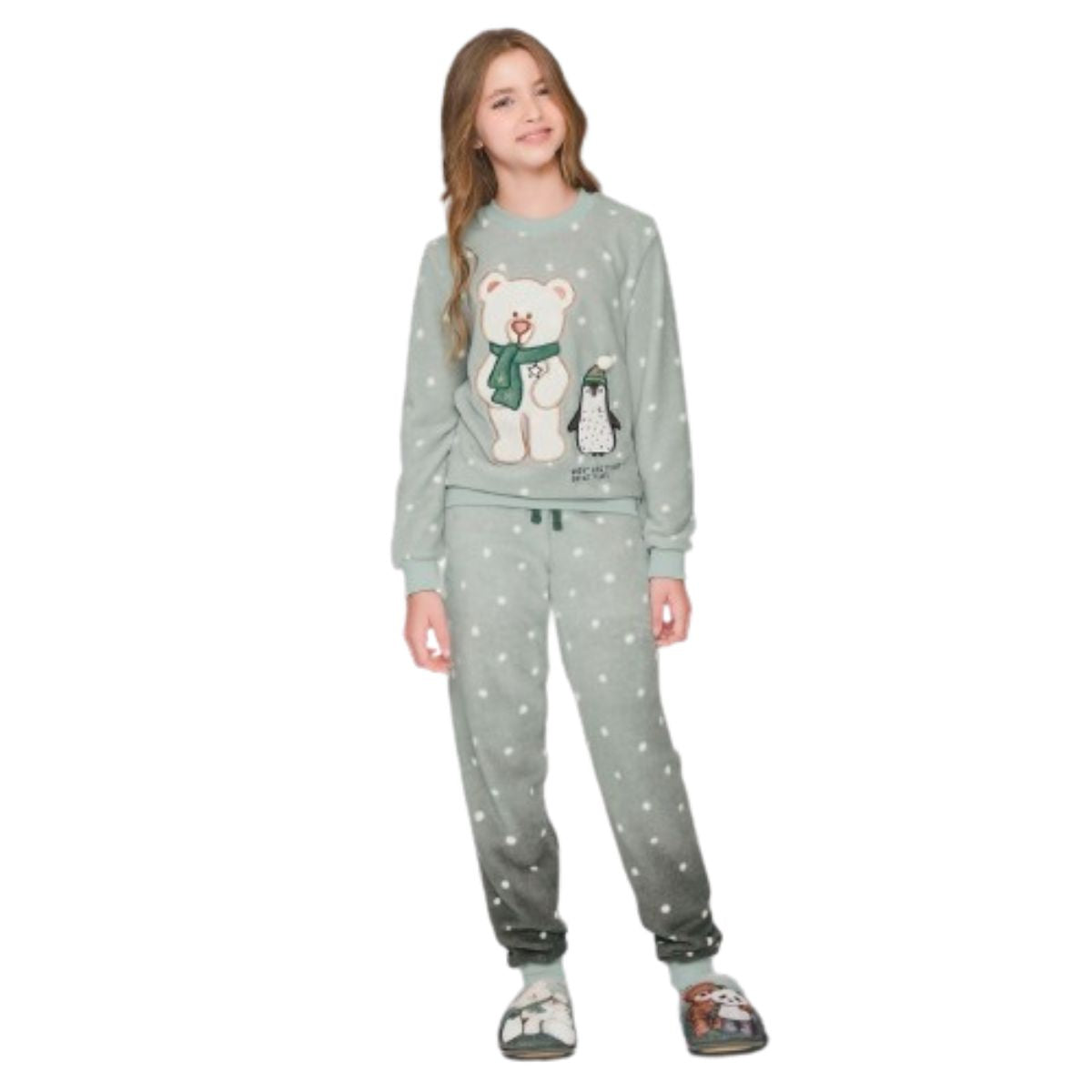 A temperatura está abaixo de 0 e a neve cai, silenciosamente, deixando a natureza coberta por delicados flocos brancos lá fora! Para o momento mais quentinho do seu bebê, esse pijama em fleece é perfeito, super macio, um carinho à parte nessa proposta divertida, onde nosso urso Ollie conhece seu novo amigo, um estiloso pinguim... toque e sinta a suavidade da pelúcia do bordado! O diferencial dessa proposta se dá ainda com os tons degradê na calça, que inicia em verde claro e vai escurecendo até o final da peça... efeito surpreendente! O acabamento em ribana 2X1 canelada garante o toque final nesse conjunto, que é rico em detalhes e vai aquecer o momento de brincadeiras e descanso da criança.