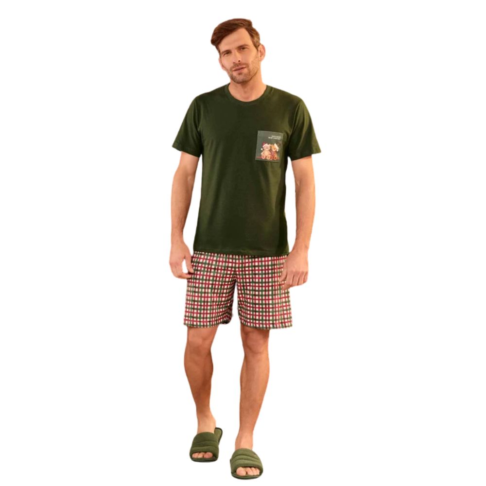 O clima de Natal invade os momentos de descanso com os nossos personagens Lulu e Steve, que encantam e trazem toda a magia dessa época especial. Esse pijama curto masculino é confeccionado em malha exclusiva Sublime Touch, com toque pele de pêssego super macio, proporcionando conforto para noites relaxantes. A camiseta lisa conta com decote redondo em ribana canelada e bolso decorativo, que possui estampa exclusiva Lua Luá com escrita "Have a Beary Merry Christmas". O short possui estampa xadrez, elástico no cós para melhor ajuste e cordão decorativo. Uma proposta repleta de espírito natalino, perfeita para criar memórias inesquecíveis ao lado de quem você ama!