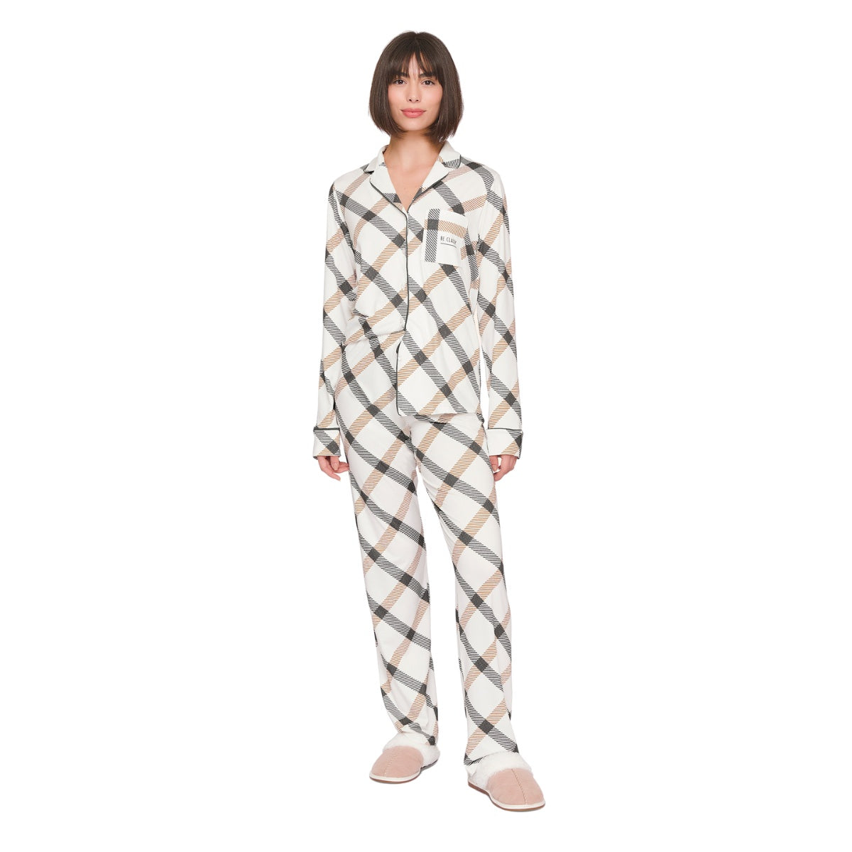 Cheio de elegância para as mulheres que gostam do clássico sofisticado. O padrão que combina duas ou mais cores já tão conhecido é reinventado em traços finos e sentido diagonal que o torna exclusivo. Nesse pijama aberto em sublime touch com visual tradicional, possui abertura frontal com acabamento em filetes e bolso com arte localizada. Ele é desejo na estação mais fria do ano e pode ser combinado com o casaco em premium flock com estampa na mesma padronagem em versão maxi.