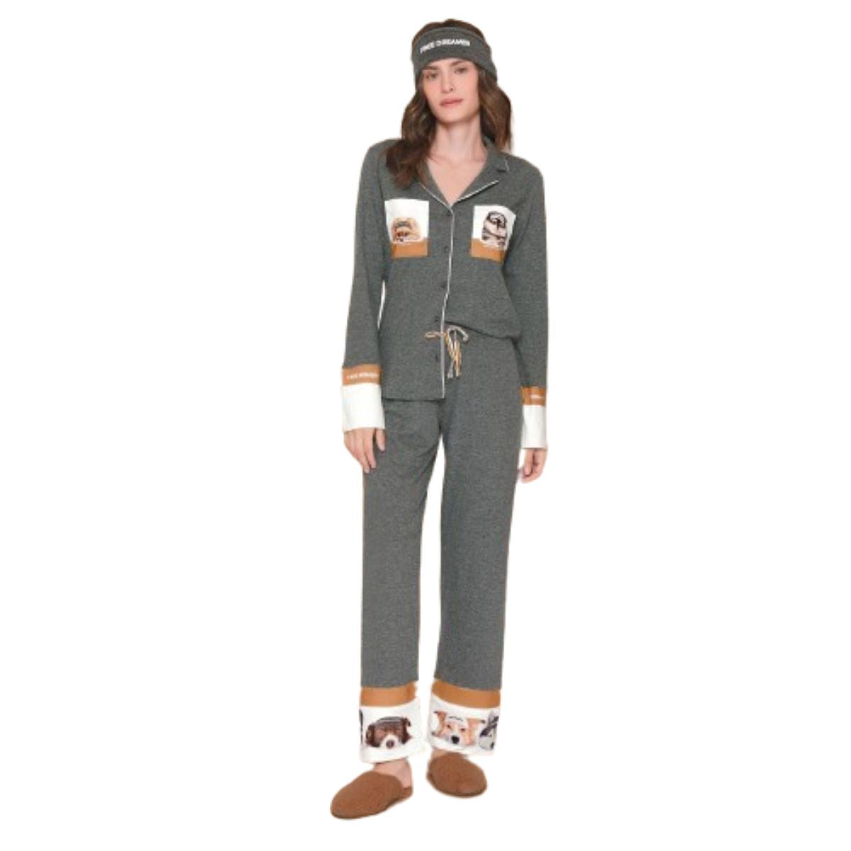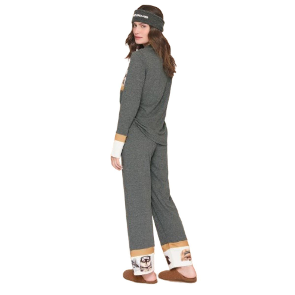 Para dog lovers!!! A temperatura está abaixo de zero, as montanhas estão cobertas pela neve e os dogs mais amados foram junto conosco para a aventura que nos inspira a nova coleção. Nesse pijama jogger especial a proposta é um mix entre a estampa rotativa super fofa de cães na neve e arte localizada nos recortes da blusa. A composição das cores traduz aconchego e suavidade à peça para o seu momento de descanso. Possui acabamento em canelado mescla e cadarço exclusivo. Escolha o seu preferido e curta junto com a família.