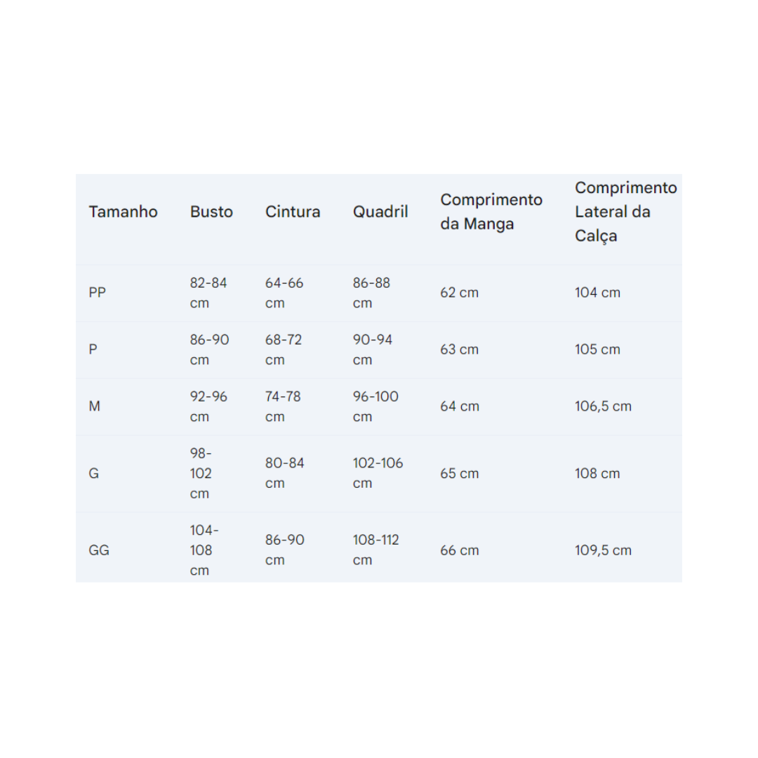 Composição: Blusa 50% Algodão 50% Poliester Calça 96% Poliester 4% Elastano