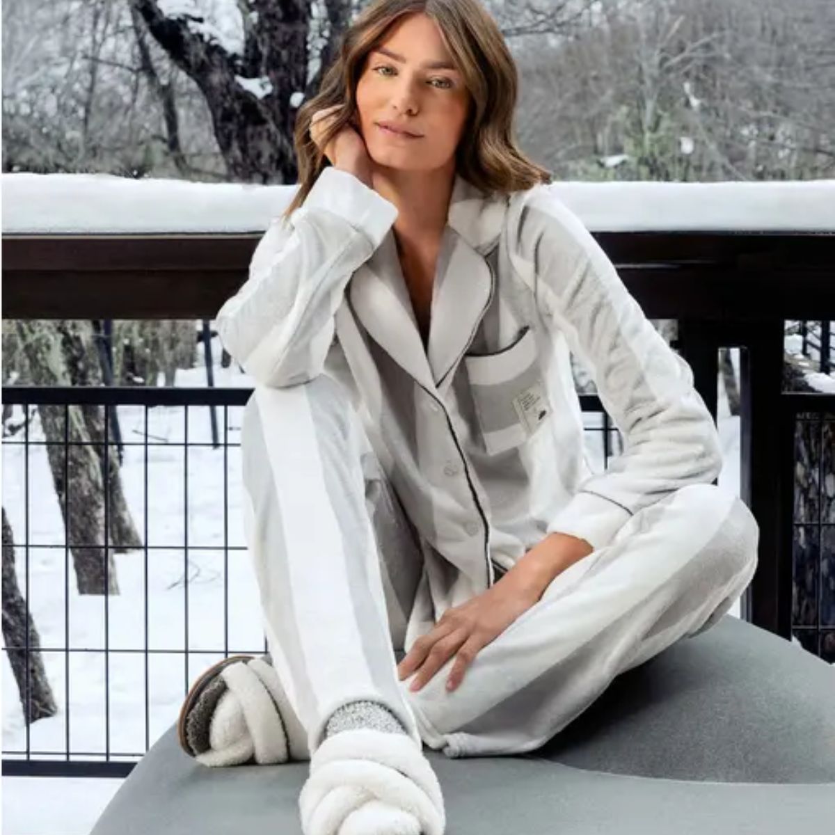 Para variar os estilos e completar esse mood confortável, esse pijama em fleece todo em estampa listrada atemporal é aquele clássico da estação. Possui fit aconchegante, com acabamento por filetes e etiqueta exclusiva. Garanta uma boa noite de sono nos dias mais frios.