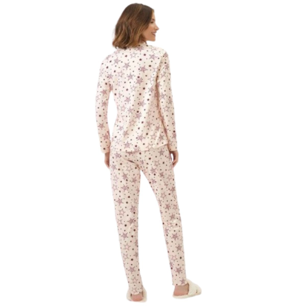 Pijama manga longa em malha comfort 100% algodão com estampa de estrelas. Blusa de modelagem tradicional com friso canelado e acabamentos em bainha. Calça afunilada com elástico 2 cm e falso amarrador no cós. Pijama divertido e confortável que podem ser feitas combinações mãe e filha!