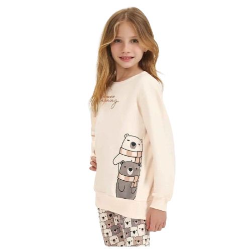 Pijama manga longa com legging infantil em estampa de ursinho. Blusa em malha de moletinho de algodão peluciado, com friso canelado e tapa costura em cadarço personalizado. Também possui cavas deslocadas, estampa escrita em foil na cor cobre e localizada de ursinho, mangas amplas e punho e barra canelados. Calça estilo legging toda estampada em malha cotton comfort, elástico 2 cm e acabamento de bainha. Ótima opção para os dias que você precisa ficar bem quentinha no inverno! Além disso, esse modelo existe no adulto, perfeito para combinações de mãe e filha.