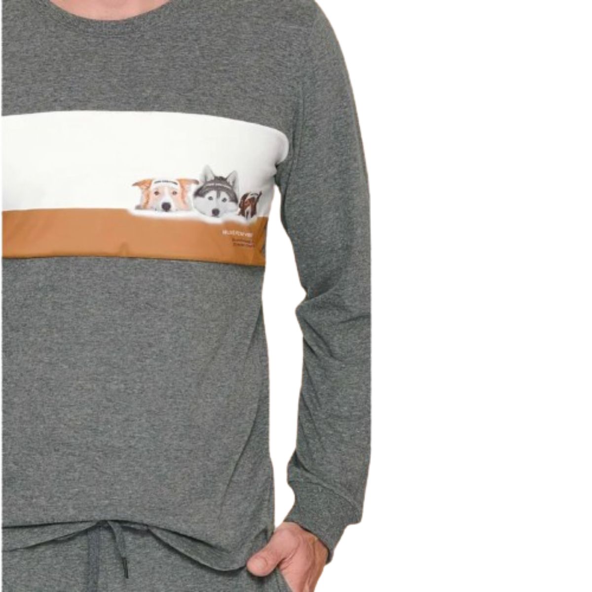 Para dog lovers!!! A temperatura está abaixo de zero, as montanhas estão cobertas pela neve e os dogs mais amados foram junto conosco para a aventura que nos inspira a nova coleção. Nesse pijama jogger especial a proposta é um mix entre a estampa rotativa super fofa de cães na neve e arte localizada nos recortes da blusa. A composição das cores traduz aconchego e suavidade à peça para o seu momento de descanso. Possui acabamento em canelado mescla e cadarço exclusivo. Escolha o seu preferido e curta junto com a família.