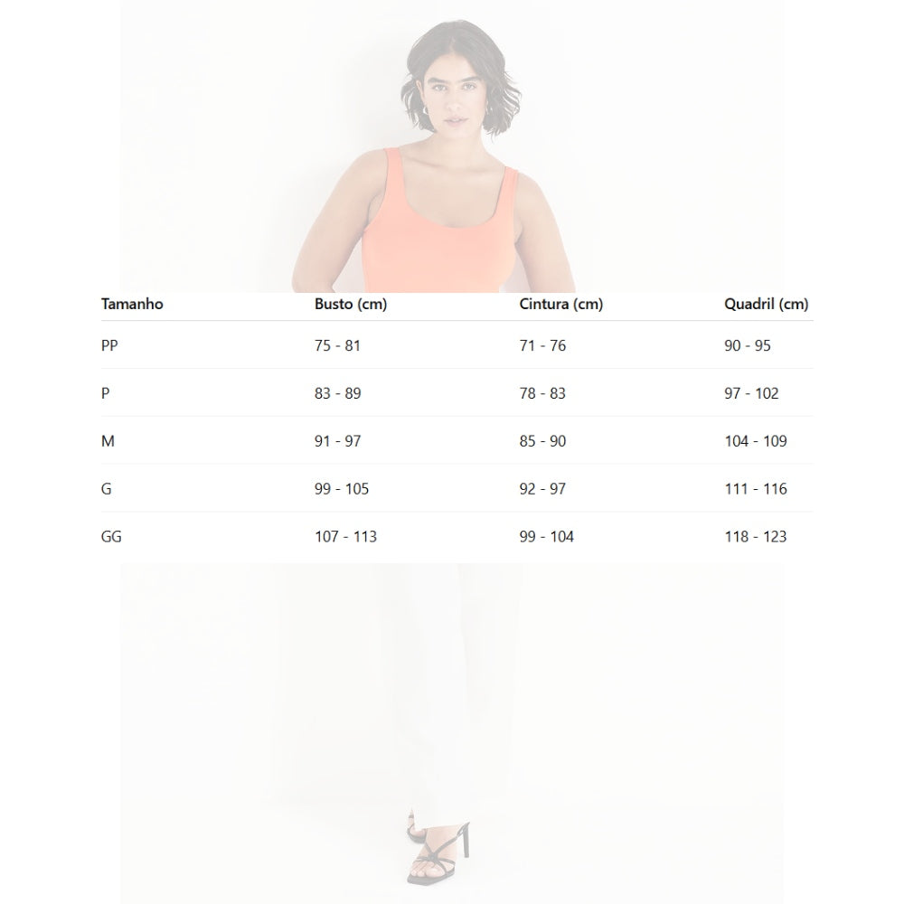 Lembre-se: As medidas de cintura e quadril correspondem à circunferência completa da peça. Medidas em centímetros