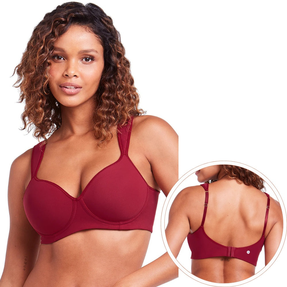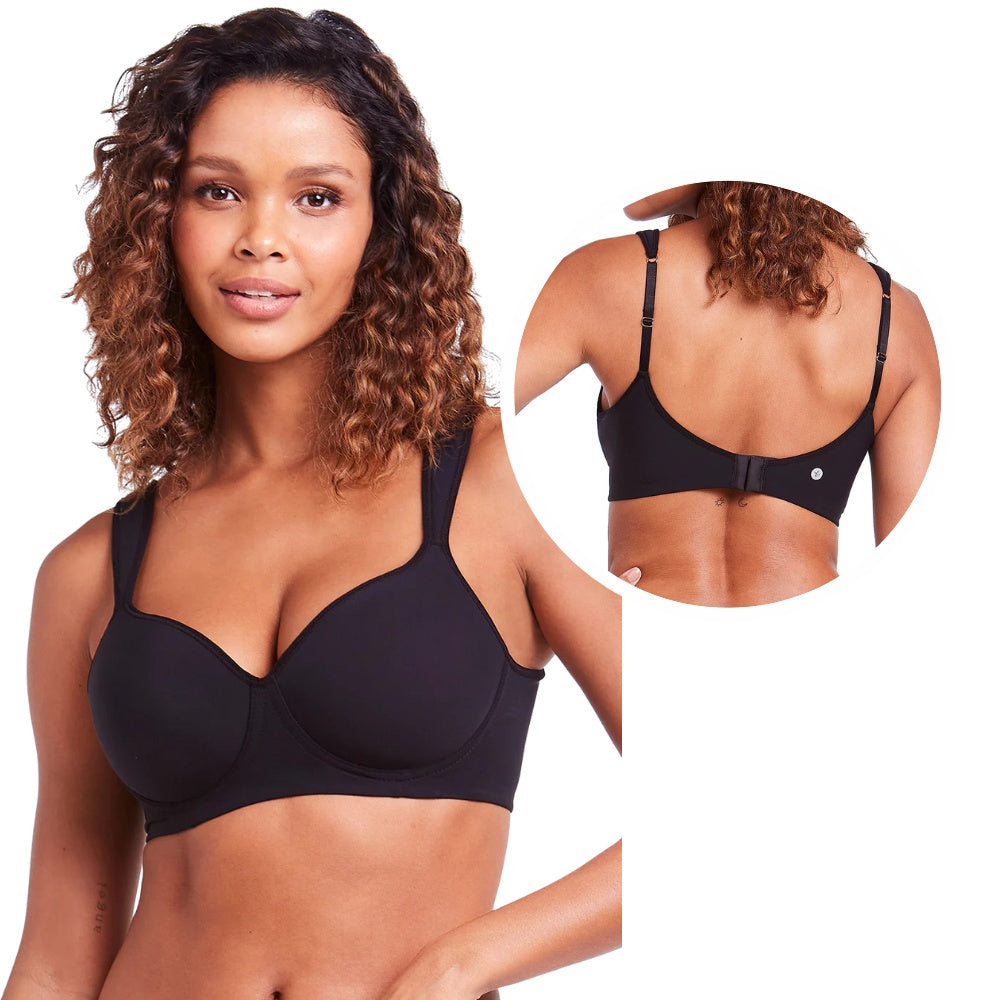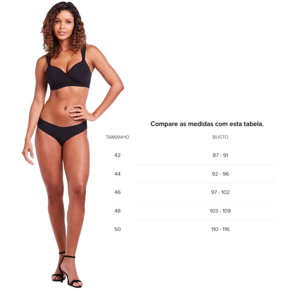 Não possui aro e apresenta um acabamento macio no contorno dos seios. Fecho com toque macio e delicado nas costas com 4 regulagens. O bojo do tamanho 42 possui um leve enchimento, os demais tamanhos não possuem, porém modelam naturalmente os seios. Toque macio como você nunca sentiu ante