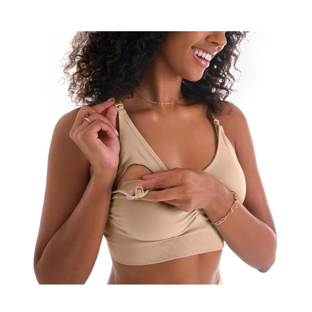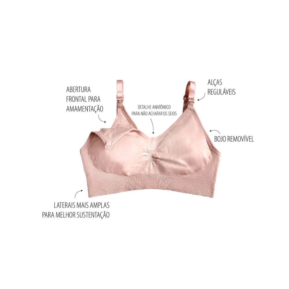 Este sutiã de amamentação também conta com camada dupla e detalhe anatômico na parte central da peça que acomoda os seios, sem achatar.