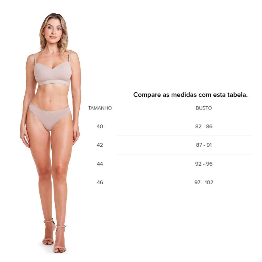 - Alças finas, reguláveis e com diversas possibilidades de uso: paralelas, cruzadas, abaixo do braço e em V.