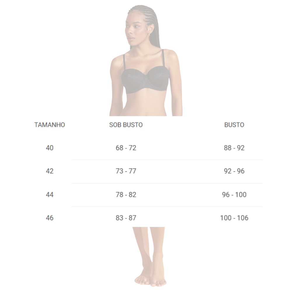 - O sutiã modelo tomara possui bojo com maior altura no centro e nas laterais, oferecendo um decote reto que proporciona maior cobertura aos seios. Com alças removíveis e um fecho de 4cm, é uma peça versátil e prática, perfeita para diferentes ocasiões.