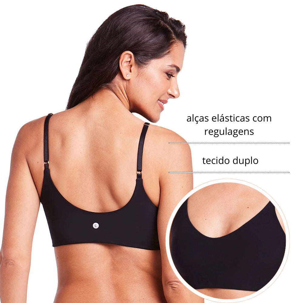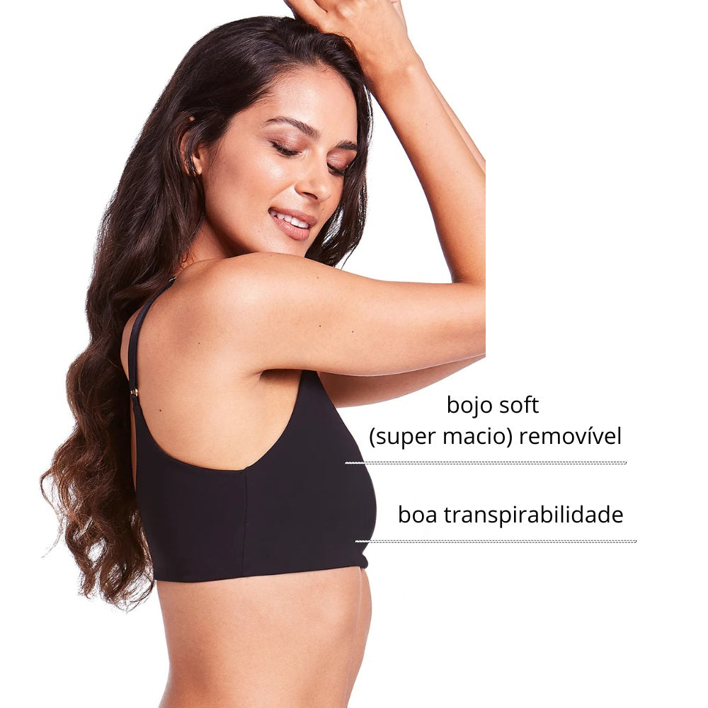Possui tecido duplo com boa transpirabilidade, bojo soft (super macio) removível e alças elásticas com regulagens. O elástico embutido na circunferência proporciona uma leve sustentação e evita marcas em contato com a pele.